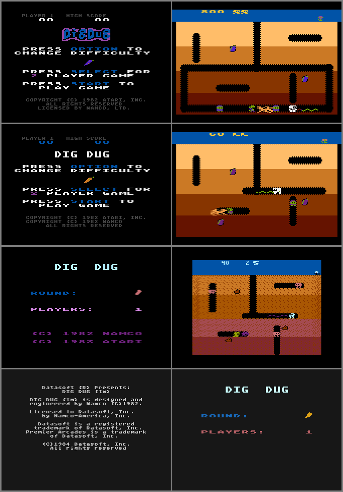 · 3 versions exist! The original released version (pictures #4 and #5) resembles the prototype version. Atari later released the 5200 version for the 400/800 (pictures #6 and #7), which included a “Dig It! Player Update” info sheet, detailing such changes as the added difficulty levels, a children’s level, and other enhancements (able to continue at the last level reached, inflating monsters when they are ghosts, etc). Datasoft also ended up re-releasing the 5200 version (with an extra title screen – pictures #8 and #9)