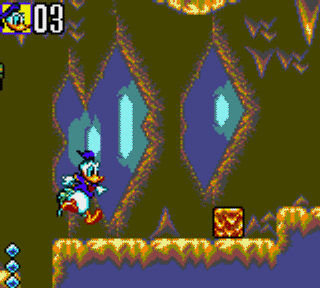trademark Disney style.Donald Duck's limited offensive repertoire consists of nothing but jumping on the heads of various creatures that for whatever reason don't like the classic character. He can also kick boxes, to both earn power-ups and if lucky, knock out an enemy. That's about all this one offers, and the primitive stylings of this platformer is enough to be a turn off. Still, the gameplay does work. There's nothing actually wrong here either, except for the excessive slowdown (which is prevalent). The character is captured, and the amount of animation packed into this cart is impressive. The multiple stand-still animations are wonderful. There are some attempts at variety, again borrowed from a staggering number of better and more well rounded titles. The usual platform sections, from the rapidly rising lava pit, underwater dives, and sudden speed boost from a power-up (a truly blatant Sonic knock-off) are here as expected from opening moments. Stage progression is up to the player, though there seems to be no actual advantage taking on one stage over another. Aimed at the