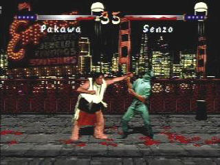 Eight pitiful fighters line the games choppy mess of a selection screen, though that's assuming you're playing with a friend. If not, all you can do is pick one (yes, one) fighter, one of the palette swapped ninja twins (read: Ken and Ryu). As you progress, you can control any fighter you defeat, sort of like "Mega Man" just without any originality or common sense. Graphically, it's not that bad. There's more animation than you usually get with a fighter of this type (they really became their own little sub-genre, didn't they?) and the backgrounds have some great depth. It's a combination of parallax scrolling and higher-than-usual resolution that tries to block you from realizing that you're not really having any fun. Oh, the blood sticks to the floor for the entire round too. Crammed into two buttons, "Kasumi Ninja" tries to blatantly mimic the competition by offering a basic punch (including a "rapid fire" version), kick, and special move button. You can duck and launch a very short-range uppercut, lean back for a roundhouse (does any of this sound familiar yet?) or go for the ever so brutal foot sweep. Fireballs and other various things you throw at the person on the other side of the screen come to life with the wasted special move button. So no one thought of anything better to do with that third button?