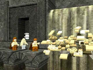 follows is my fair, unbiased, un-fanboyish review of this game.OH MY GOD THIS GAME RULES! In Lego Star Wars, one or two players can play their way through the new trilogy of Star Wars films, Episodes I, II, and III. From the sandy dunes of Tattooine to the raging seas of Kamino and the bustling skies of Coruscant, Lego Star Wars takes you chronologically through all three newer Star Wars films, including the as-of-yet unreleased Episode III: Revenge of the Sith. While this review contains no spoilers, be warned that the game itself does. Players begin the game in Episode I, Level I, with Qui-Gon Jinn and Obi-Wan Kenobi. In one player mode you can choose one or the other (and swap between them freely), and in two-player mode everybody gets to play. With these characters you'll learn the basic controls. You can jump, draw your weapon/attack, put away your weapon, switch between characters, and use the Force. Items that can be Force-controlled will glow when you approach them. Throughout the game you?ll need to move objects around to build bridges, flip switches and levers, and do all perform various other tasks. The Force can also be used to shake down trees, planters, and other objects throughout the game to find hidden "studs." Studs (Star Wars Lego coins) are collected throughout the game and can be used to purchase items in between levels (everything from fake moustaches for your characters to invincibility). In Lego Star Wars you get infinite lives, but every time you die you lose all your studs. There are three basic