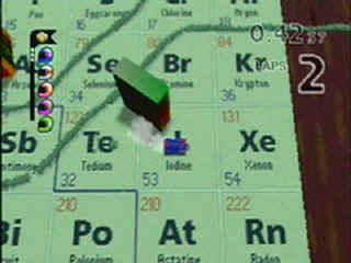 they have no distinct advantages over each other on the courses. These tracks make the series what it is, set on various tables, bathtubs, and kitchens around the house. Staying on course means following the cereal lining them (watch out for the milk), or whatever else the barrier may be. You can make minor shortcuts almost anywhere, but veer too far and you'll self-destruct. There's not much room for error either. These tracks are tightly wound, and pushing opposing vehicles off ledges or into hazards is part of the fun. The variety of vehicles is fantastic, adding in some necessary play variety to keep this title away from its otherwise simple roots. Control is important with the tracks as they are. Anyone who attempts to take these on at full speed, regardless of how well their car controls, will smash into something or miss a crucial jump. The problem with the N64 version is how the developers have tried to make the camera active. It's a random viewpoint for the most part, wildly swinging around or zooming. It maintains the trademark overhead view (which is where the reaction times come in) only part of the time. There are points where it wraps around to actually be in front of the players car, making it impossible to see incoming hazards in time. It's a nasty surprise. Still, a great game