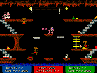 Imagine if you will, game play mechanics from such classics as Donkey Kong, Burgertime, and Food Fight in a modern game with TONS of levels, digitized speech, and a wonderful sense of humor. The object is to manipulate the swine protagonist to eat all the food while avoiding wolves and occasionally a mad butcher. Weapons are used to fend off enemies, ranging from tin cans to boomerangs to bowling balls. I don't remember all the levels, but I do remember a library, Italian restaurant, burning building, sewer, circus, factory, and parking garage. And each level had its own special nuances, such as the tightrope and ball balancing seal in the circus, the chef constantly tossing meatballs in the Italian restaurant, the trampoline held by firemen beneath the burning building, alligators and vines in the sewer, conveyor belts in the factory, and elevator in the parking garage.
