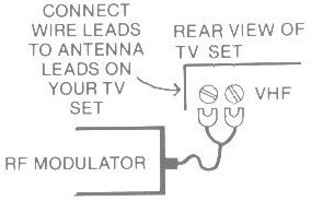 7. Connect the RF Modulator to your television set. For this you'll need a screwdriver. The short TV connector cord runs from the RF Modulator box to the 2 VHF Antenna leads on the back of your television. Simply connect the two wires to the VHF leads and tighten the screws firmly.